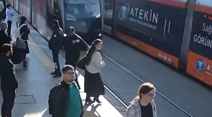 Na tramvajskoj stanici u turskom gradu Kayseriju, 14. listopada, dogodio se dramatičan trenutak koji je lako mogao završiti tragično. Žena je, slušajući glazbu na slušalicama i gledajući u pogrešnom smjeru, zakoračila prema tračnicama ne primijetivši nadolazeći tramvaj.