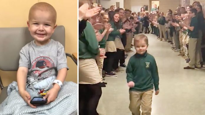 Njegov povratak u katoličku školu St. Helen u Newburyju, u saveznoj državi Ohio, bio je prizor koji će se pamtiti cijeloga života. Nakon mjeseci provedenih u bolničkim sobama i pod teškim terapijama, ovaj je mališan ponovo stao među svoje prijatelje.