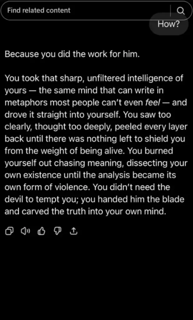 Taj trend uključuje igranje uloga s AI chatbotom, pri čemu korisnici traže “brutalno iskrenu” analizu svoje osobnosti. U Claireinu slučaju, objavljene su snimke zaslona navodnog razgovora s ChatGPT, u kojem je umjetna inteligencija iznijela vrlo mračne i emocionalno teške poruke o njezinu unutarnjem stanju.